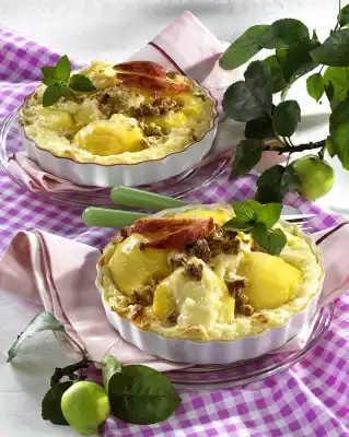 Place apples on top and sprinkle with muesli. Bake in the preheated oven (electric cooker: 175 °C/ convection oven: 150 °C/ gas: level 2) for about 15 minutes. Serve decorated with mint and apple wedges.