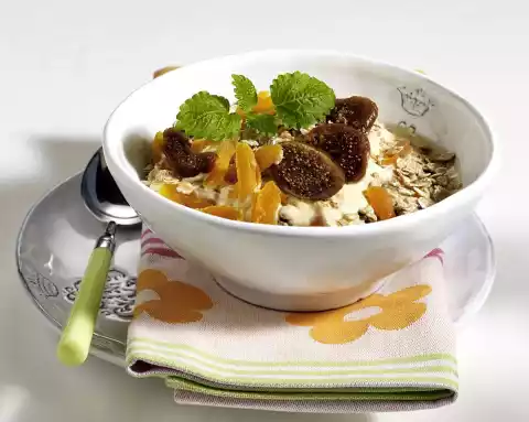 Cut the rest of the figs into pieces. Mix fig, apricots, oat flakes and sea buckthorn sour milk. Arrange muesli in a bowl and decorate with fig slices, apricot strips and mint.