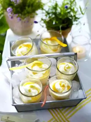 Drain the apricots and puree with 2 tablespoons of sugar. Distribute mascarpone cream and apricot puree in layers in 10 glasses. Stir gently with a teaspoon to create streaks. Glasses min.