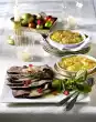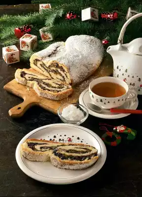 Fold the aluminium foil several times, so that a strip approx. 5 x 70 cm wide is created. Knead the dough. Spread on baking paper to form a rectangle (approx. 30 x 40 cm). Spread the filling over it. Use the paper to form a stollen and wrap the aluminium strip around it. Bake in a hot oven (electric cooker: 200 °C/ convection oven: 175 °C/gas: level 3) for about 25 minutes. Brush with 50 g butter while hot, dust with icing sugar