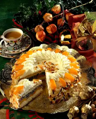 Spread with poppy seed mixture and cover with the second base. Put the cake in a cool place for about 1 hour. Whip the remaining cream and sugar until stiff. Remove the cake from the tin and spread a good half of the cream all around.