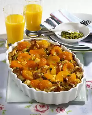 Drain the apricots (use the juice for other purposes). Roughly dice the yeast plait. Roast in 1 tbsp. hot butter in a large pan until golden brown. Mix 3 tbsp. sugar and cinnamon and sprinkle over the top. Put into a well greased casserole dish