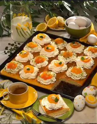 Whip the cream until stiff and allow the vanillin sugar to trickle in. Pour into a piping bag with a large star-shaped spout. Divide the cake into 16 pieces. Spray a large cream tuff on each piece. Decorate with apricots, pistachios, almonds and balm. Makes about 16 pieces