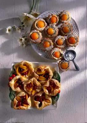 Grease 12 small brioche cups (alternatively paper cups) and sprinkle with semolina. Put one tablespoon of dough into each form. Place an apricot half on top. Bake in a preheated oven (electric: 200 °C/ gas: level 3) for 20-25 minutes.