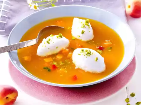 Wash, halve, stone and cut the apricots into small pieces. Chop the pistachios. Arrange soup and apricot pieces in plates. Remove the dumplings with a skimmer and add 3 dumplings each to the soup. Sprinkle with pistachios and serve