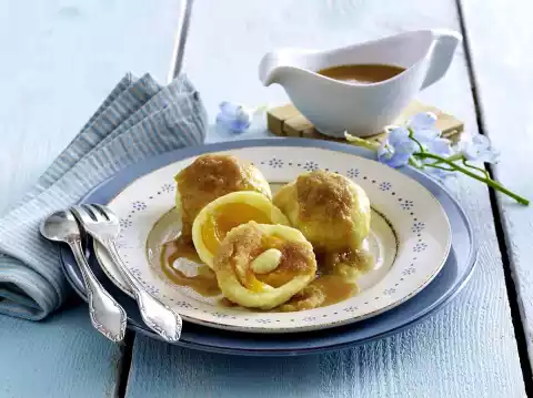 Remove the dumplings and let them drip off briefly on kitchen paper. Serve the dumplings with crumbly butter and caramel sauce. Dust with icing sugar.