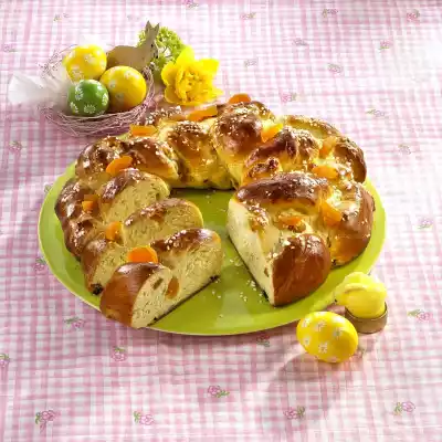 Divide the dough into thirds and form into strands of about 60 cm each. Weave the strands into a braid and lay them together on a baking tray lined with baking paper to form a wreath. Leave to rise again for another 15 minutes. Whisk the egg yolks and cream, brush the wreath with it and sprinkle with sugar crystals. Bake in the preheated oven (electric cooker: 200 °C/ convection oven: 175 °C/ gas: level 3) for 35-40 minutes. Allow to cool and decorate with apricots set aside