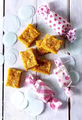 Mix apricots, almonds and grated coconut. Fold the aluminium foil into a solid frame, press it to the inner edge of a square springform pan (24 cm x 24 cm) so that the corners are at right angles. Line the springform pan with baking paper. Pour the mixture into the tin (approx. 1 1/2 cm thick). Bake in the preheated oven (electric cooker: 150 °C/ convection oven: 125 °C/ gas: see manufacturer) for about 20 minutes. Remove the mould from the oven and cut into pieces (approx. 4 x 5 cm). Put back into the oven and bake for another 8-10 minutes. Take out and let cool down