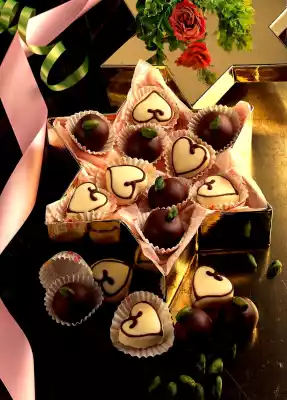 Dice the apricots and chop finely in the universal chopper. Sprinkle with the liqueur and let it stand covered for about 1/2 hour. Add marzipan paste and sieved icing sugar. Knead everything well together. Roll out the mixture between 2 layers of cling film approx. 1 1/2 cm thick and cut out small hearts (approx. 3 cm). Melt light and dark chocolate separately in a hot water bath.