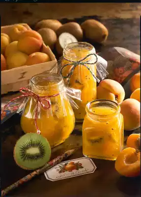 Scald apricots hot, rinse with cold water and peel the skin. Core the apricots and cut into large pieces. Peel the kiwis, cut them in half lengthwise and slice them. Mix fruit, rum and jam sugar in a pot. Bring the fruit mass to the boil while stirring and let it boil over a high heat for 1 minute while stirring. Remove jam from the stove, skim, stir, fill into prepared glasses and close