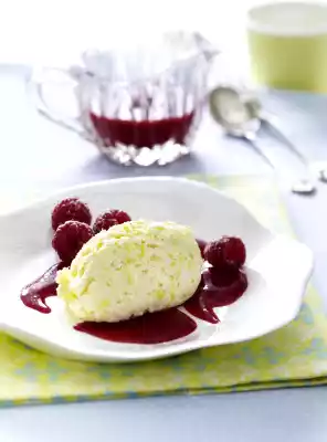 Select the raspberries, rinse and drain if necessary. Puree 2/3 raspberries and 1 tsp. sugar and pass through a sieve. Use a tablespoon to cut off any cams from the mousse. Serve with raspberry sauce and the remaining raspberries.
