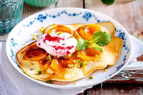 Heat 1 teaspoon butter in a small coated pan (approx. 18 cm Ø). Sauté 6 apricot halves in each pan for 2-3 minutes while turning. 1⁄4 Pour the dough over the apricots and fry on each side for about 2 minutes until golden brown. Keep the pancakes warm. Bake 3 more pancakes in the same way.