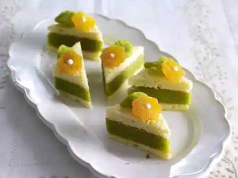 Knead marzipan, pistachios, icing sugar and liqueur and remove approx. 30 g. Form 24 small leaves from the marzipan. Cut the apricots in half horizontally and cut out 24 small flowers. Roll out the rest of the marzipan between 2 layers of cling film in a rectangular shape (approx. 15 x 16 cm).