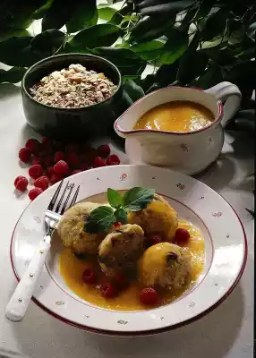 Puree the apricots with the cutting stick of the hand mixer. Season to taste with remaining honey and lemon juice. Arrange dumplings with apricot sauce. Select the raspberries and sprinkle over the dumplings. Garnish with some mint as desired.
