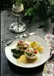 Leave to stand in lightly boiling water for 15-20 minutes. In the meantime, lightly carve the apricots, blanch with boiling water and peel the skin. Cut the fruit in half and remove the stone.