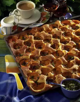 Drain the apricots well. Beat the fat and fruit sugar with the whisk of the hand mixer until foamy. Stir in eggs bit by bit. Stir in milk. Mix flour and baking powder, stir in. Spread the dough on a greased baking tray (35 x 40 cm)