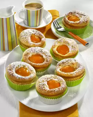 Line 1 muffin tin (12 wells) with paper cups. Spread the dough evenly over them. Place 1 apricot half on top with the convex side facing upwards. Use the remaining apricots for other purposes. Bake the muffins in a preheated oven (electric cooker: 175 °C/ convection oven: 150 °C/ gas: level 2) for 20 minutes. Remove from the oven and let them cool down on a cake rack. Dust the muffins with icing sugar
