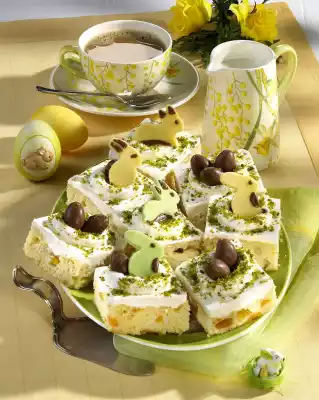 Knead both well and roll out thinly. Cut out small bunnies (2.5 - 3 cm Ø) from them. Warm up the chocolate writing in warm water for about 3 minutes. Decorate the bunnies with it. Mix 250 g quark and lemon peel. Whip the cream until stiff, allowing the vanilla sugar to trickle in. Fold 150 g cream under the quark. Smooth the cream on the base. Fill the rest of the cream in a piping bag with perforated spout. Cut the cake into 24 pieces. Spray small cream nests onto the slices. Sprinkle nests with pistachios and put chocolate bonbons and bunnies inside
