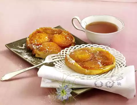 Place apricot halves (3 halves per tartlet) with the cut surface on the caramel. Roll out the shortcrust pastry 2-3 mm thin on a floured work surface and cut out 9 circles (12 cm Ø), kneading and rolling out the pastry again. Place circles over the apricots and press them firmly at the edges. Bake the tartlets in the preheated oven (electric range: 200 °C/ convection oven: 175 °C/ gas: level 3) for 15-20 minutes. Allow the tartlets to cool for 2-3 minutes and then turn them out onto plates. Dust with icing sugar