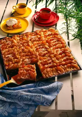 Place the apricots close together. Bake in the preheated oven (electric: 175 °C/ gas: level 2) for 45-50 minutes. While still warm, sprinkle with sugar crystals and let cool. Whipped cream is delicious with it.