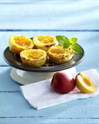 Grease the troughs of a muffin tin (12 troughs). Line with the dough circles, press well. Put them in a cold place. Wash the apricots, cut them crosswise and blanch with hot water. Quench cold and peel the skin.