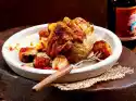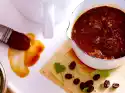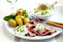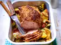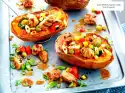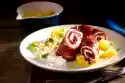 12 Cut open the soft apricots horizontally, but do not cut through them. Fill each with 1 level teaspoon of goat's cream cheese (approx. 60 g). Cut 6 bacon slices in half lengthwise. Wrap each apricots with 1⁄2 bacon slices. Fix with wooden skewers. Heat 1 tbsp. olive oil and fry the apricots on each side until crispy.