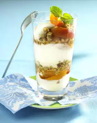 Wash and quarter the apricot and remove the stone. Fill yoghurt, apricot slices, honey and muesli alternately in 2-3 layers into a tall glass and decorate with lemon balm.