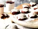 For the macarons, draw about 12 circles (6.5 cm Ø each) on two sheets of baking paper. Turn the paper over and place it on the trays. Grind the almonds finer with 60 g icing sugar in the universal chopper. Beat the egg white with 1 pinch of salt until stiff, sieve 100 g icing sugar and stir in by the spoonful.