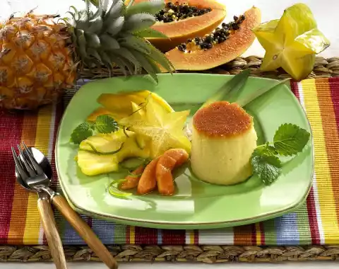 Wash the starfruit, dab dry and cut into slices. Mix lime juice with brown sugar and boil up once. Leave to cool. Let the moulds cool down as well. Use a knife to carefully remove the pudding from the rim of the mould and turn it out lukewarm. Arrange fruit and pudding on plates and drizzle with lime sauce. Decorate with lemon balm and lemmettests