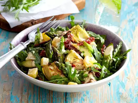 Arrange rocket in bowls, arrange artichoke and asparagus vegetables on top