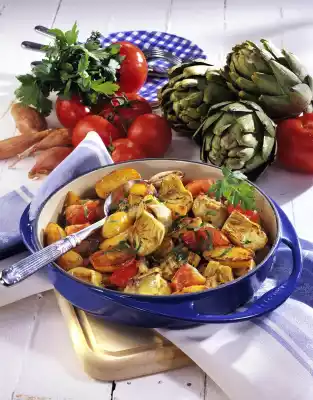 About 5 minutes before the end of the cooking time, add the shallots and artichokes to the potatoes and fry them. Add the tomatoes and deglaze with the white wine. Fry for 2-3 minutes more. Season with salt and pepper and sprinkle the parsley on top.