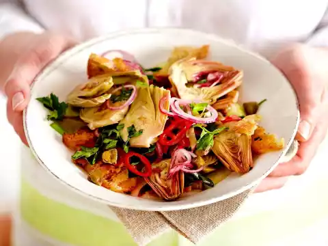 Add spring onions, onion, cucumber and parsley to the artichokes and mix well. Season to taste with salt and pepper. Break bread roughly into pieces, fold into the salad and arrange in deep plates