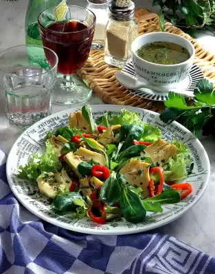 Clean, wash and drain the lollo bianco and lamb's lettuce. Pluck the lollo bianco into bite-sized pieces. Drain the artichokes and peppers. Mix vinegar, salt and pepper.
