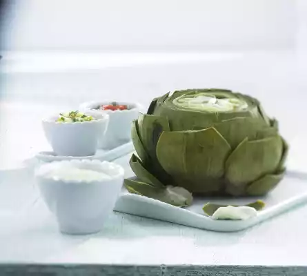 Cook immediately in plenty of boiling salted water for about 35 minutes. Only the bottom and the lower part of the sepals are edible. For the garlic sauce peel the garlic and press it through a garlic press.
