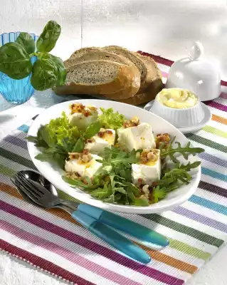 Turn the pellet cheese onto a tea towel and drain well. Clean, wash and drain the salads. Pluck into bite-sized pieces