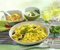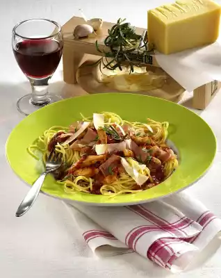 Press the garlic through a garlic press. Wash the rosemary, pluck the needles from the stalks and chop finely. Season sauce with salt, pepper and rosemary. Cut the ham into strips, add and simmer everything for about 10 minutes.