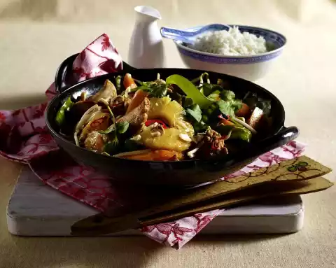 Add the carrots, pineapple and sugar snap peas and fry. Add the chilli pepper and sprouts and fry for about 2 minutes. Fill up pineapple juice with water to 250 ml. Deglaze vegetables with chili sauce and pineapple juice, bring to the boil and season with salt and pepper.