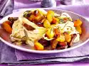 In the meantime, halve the peppers, clean, wash and cut into strips. Clean, wash, dab dry and halve the leaves. Clean and peel the pineapple and cut out the stalk. Cut the flesh into cubes.