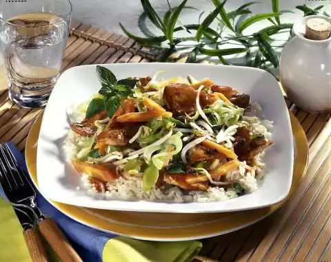 Boil the rice in about 1/8 l boiling salted water, cover and let it swell for about 20 minutes. Wash meat and vegetables, cut into strips. Fry meat in hot oil in a coated pan. Season, take out.