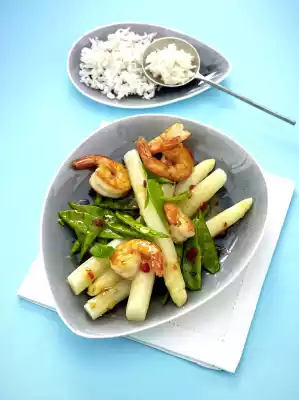 Mix vegetables with asia sauce, arrange on plates. Spread prawns on top. Serve with ##rice##.