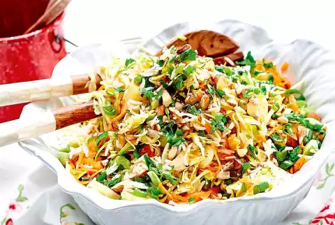 Mix rice with cabbage, carrots, spring onions, parsley, sunflower seeds, almonds, pineapple and the vinaigrette. Leave to stand for at least 1 hour, stirring several times. Season salad with salt and pepper.