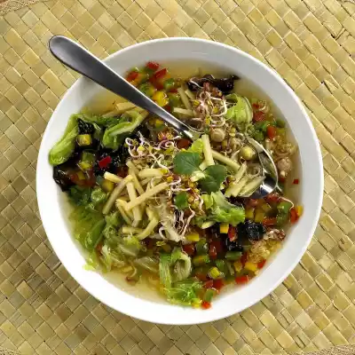 Pour broth into the vegetables and cook over medium heat for about 20 minutes. In the meantime read out the radish sprouts. Before serving, season the soup with lime juice and soy sauce. Garnish with radish sprouts.