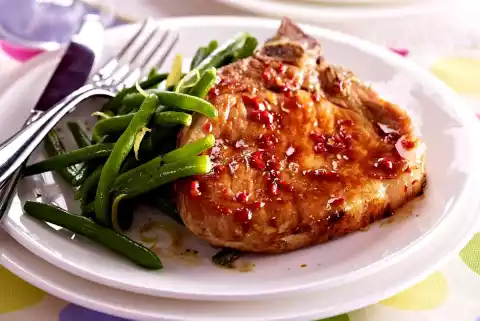 Wash the chops and pat dry. Peel garlic and chop finely. Mix garlic, chilli and soy sauce. Spread a thin layer on the chops. Keep the rest of the marinade.