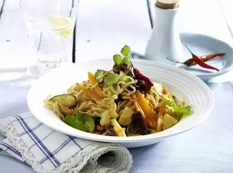 Cut the pod into fine pieces. Pour the mushrooms into a sieve and drain. Heat the oil in a large pan and fry the vegetables and mushrooms thoroughly, turning them over. Add the noodles, garlic and chilli and fry until brown.