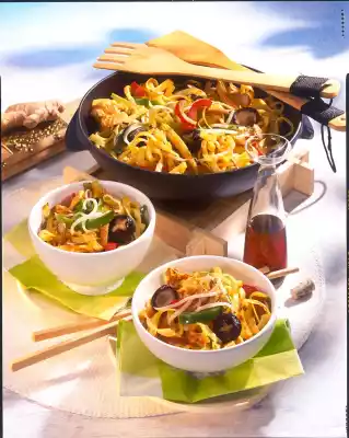 Clean and rub the mushrooms and possibly carve them crosswise. Peel ginger and cut into fine slices. Heat oil in a wok or frying pan. Stir-fry the bell peppers, leek, mushrooms and ginger for about 2 minutes.