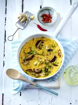 Heat the oil in a large coated pan (with lid). Brown the prepared ingredients in it, season with salt and pepper. Whisk eggs, season and add. Cover and allow to set for approx. 15 minutes over medium heat.