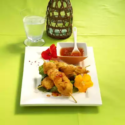 Bake in hot fat for 3-4 minutes until golden brown. Place skewers on kitchen paper to drain. Mix the spinach with the vinaigrette and arrange on plates. Place skewers on top. Serve with chilli sauce. Garnish with nasturtium blossoms
