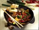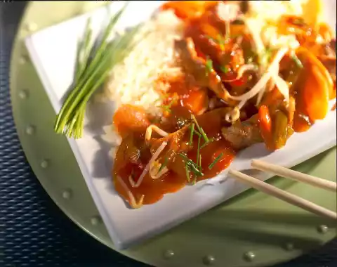 Fry vigorously all around in hot oil. Season with salt and pepper. Add carrots and sprouts and cook for about 3 minutes. Add "sweet and sour" and 50 ml water and heat up as well.