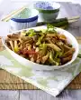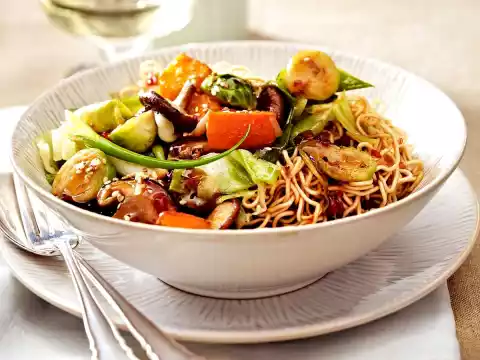 Put the Brussels sprouts and white cabbage back into the wok, fold in well. Add the soy and Asian sauce and cook everything for about 3 minutes. Loosen the noodles with a fork and drain. Arrange the vegetables with the noodles and sprinkle with sesame seeds.