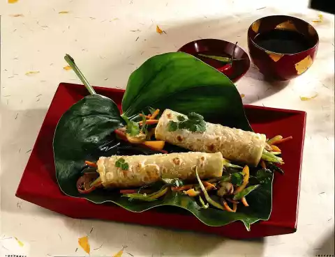 Roll out into flat cakes of approx. 16 cm Ø. Spread lightly with sesame oil and fry in a pan without fat for 1-2 minutes on both sides until golden brown. Keep the pancakes warm. Peel or clean and wash the vegetables.